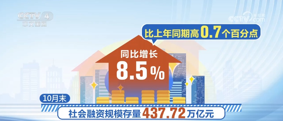 央视新闻记者:11月13日,中国人民银行公布10月份金融数据。 10月份社会贷款规模增速保持较高水平,持续营造适宜的金融金融环境,增强经济复苏势头。 10月末,社会融资规模437.72万亿元,同比增长8.5%,比上年同期提高0.7个百分点。前10个月社会融资规模累计增加30.9万亿元,比去年同期增加3.83万亿元。专家分析,10月份国债、专项再融资债等国债发行较快,企业债发行热度较高,为社会财政扩张提供了重要支撑。 “2025年特别超长期国债发行规模由1万亿去年狮王人民币增至1.3万亿元。本次发行时间比去年提前了一个月左右,相应的,发行完成时间也提前了。 “这体现了财政对经济增长的支持和需求刺激,也促进了社会金融规模的扩大。”专家表示。10月末,广义货币(M2)余额335.13万亿元,比上年增长8.2%,保持较高增速。限制性货币(M1)余额112万亿元,同比增长6.2%。前10个月现金净注入10月末,各类人民币贷款余额270.61万亿元,同比增长6.5%。另外,数据显示,10月份新增企业贷款平均利率为3.1%。10月份同比下降约40个基点。新增个人住房贷款平均利率为3.1%,比去年同期下降约8个基点。商务部:支持上海国际贸易中心提质增效。商务部11月13日召开例行新闻发布会表示,将会同有关部门积极支持上海国际贸易中心提质升级。商务部新闻发言人何亚东表示,今年1-10月,上海实现进出口3.7万亿元,增长5.2%,其中出口1.6万亿元,增长10.5%。上海港集装箱吞吐量连续15年位居世界第一。服务贸易加速发展,数字贸易活力增强。一月至九月今年,上海服务进出口同比增长5%。上海已开通30多个国际互联网专用通道,建立多个高水平算力中心。发言人表示,要按照国际经贸高水平标准进一步扩大开放。 80项开放改革举措在上海自贸试验区全面落地,77项举措在全国和其他自贸试验区复制推广。保税修复业务范围不断扩大,我们在日本启动了首个保税修复业务试点项目。下一步,商务部将会同有关部门,围绕创新、协调、安全、保障等四个方面,帮助上海更好统筹货物贸易、服务贸易、数字贸易三大支柱。d规则,进一步丰富上海国际贸易中心的功能和内涵。东盟连续八年保持中国第一大农产品和食品贸易伙伴地位。据海关统计,今年前10个月,中国与东盟贸易总额达86.27亿美元。美元比上年增长8.2%,其中双边农产品和食品贸易额达到513亿美元,比上年增长8.9%。东盟连续八年保持中国第一大农产品和食品贸易伙伴地位。今年前10个月,我国水利设施建设完成投资超过1万亿元。记者从水利部获悉,今年1-10月,我国完成水利建设投资10947亿元实施各类水利工程4.6万个,新开水利工程2.8万个。湖南洞庭湖区、广东黄茅溪、广西邕北灌区主坝除险加固二期等一批新的大型水利工程相继启动。中国已完成6G技术第一阶段测试。记者从工信部获悉,我国已完成6G技术第一阶段测试,形成300多项关键技术储备。今年以来,6G推进团队已在沉浸式通信、无线智能等5大技术方向进行了57项测试。 6G目前正处于国际标准研究阶段,预计2030年左右开始商用部署。中国最大的信标船“海一号”UN 176于11月13日正式入列,我国自主设计建造的大型航标船“海云176”正式纳入交通部南海航行保障中心。 “海巡176”总长75.2米,续航里程5000海里。该船采用全电力推进系统,将重点在琼州海峡、三沙等海域作业,负责区域内助航设施的部署、维护和管理等任务。自然资源部11月14日发布消息称,中国辽东省发现千吨级金矿床。辽宁省地矿集团在辽东大东沟金矿成功发现全国首个千吨级超大型低品位金矿床。共发现金属金1,444.49吨,为全国最大的金属金矿产地。中华人民共和国成立以来发现的第一处金矿。目前已通过开发利用经济论证,预期效果良好。